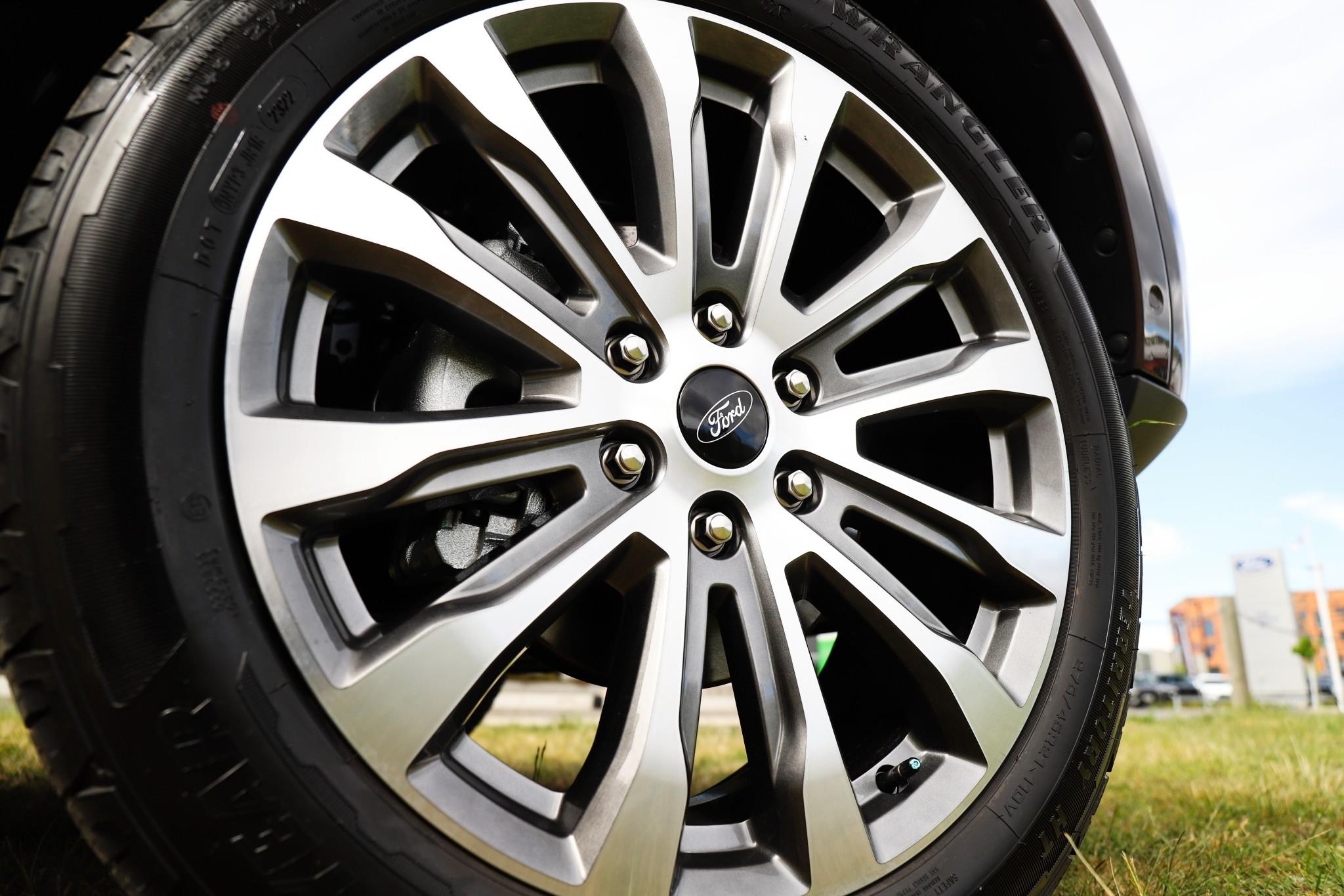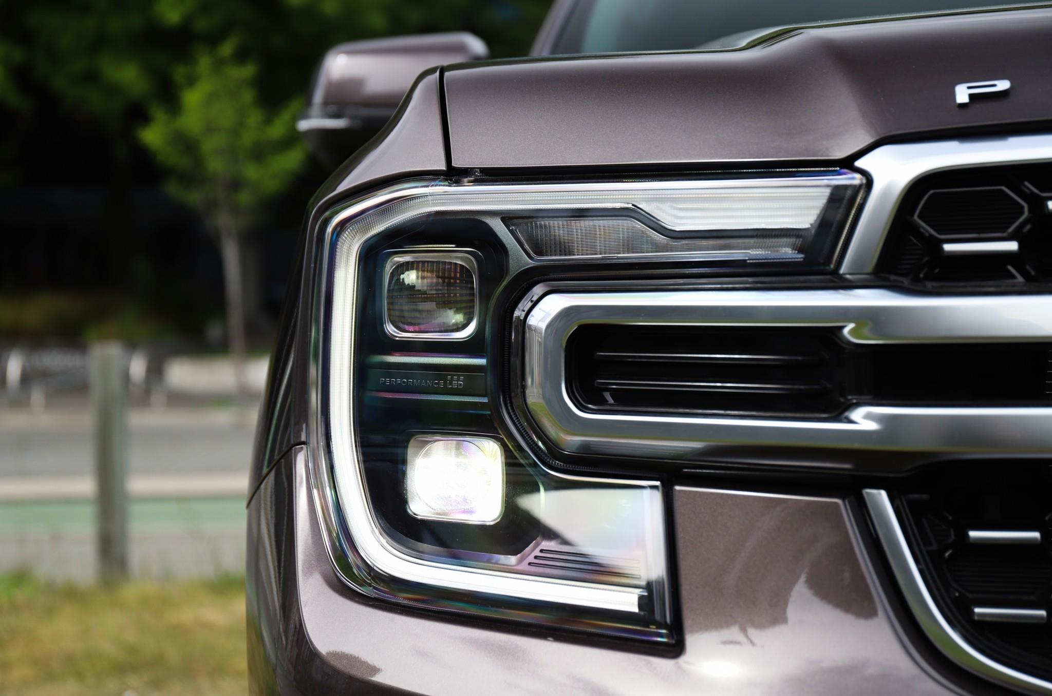 Ford global DNA grille with chrome accents, C-clamp Matrix LED headlights, LED fog lamps, and 21" machine-face alloy wheels